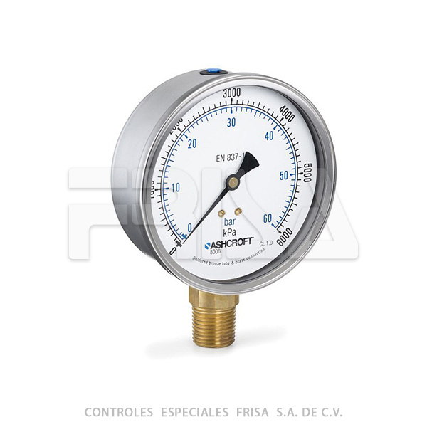 Manómetro con internos en bronce, caja de acero inoxidable 304, conexión de latón, rangos disponibles desde vacío hasta 15,000 PSI, disponible en caratula de 63 mm (2 1/2″) o 100 mm (4″), conexión inferior o posterior de 1/4″ o 1/2″ NPT, exactitud ±1.6%