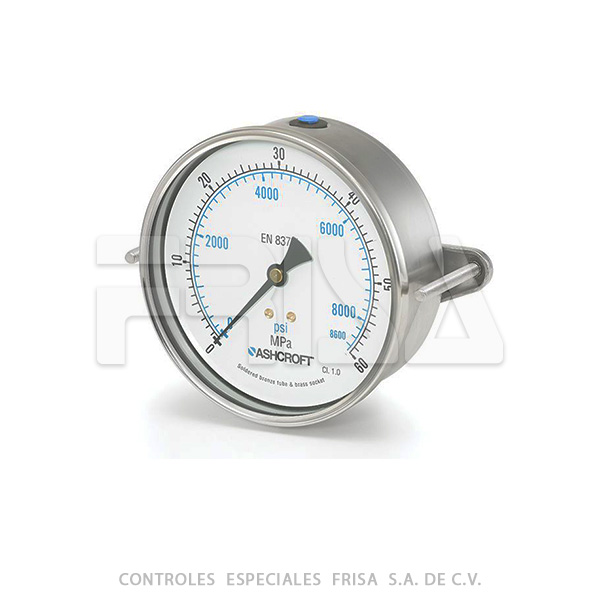 Manómetro con internos en bronce, caja de acero inoxidable 304, conexión de latón, rangos disponibles desde vacío hasta 15,000 PSI, disponible en carátula de 63 mm (2 1/2″) o 100 mm (4″), conexión inferior o posterior de 1/4″ o 1/2″ NPT, exactitud ±1.6%